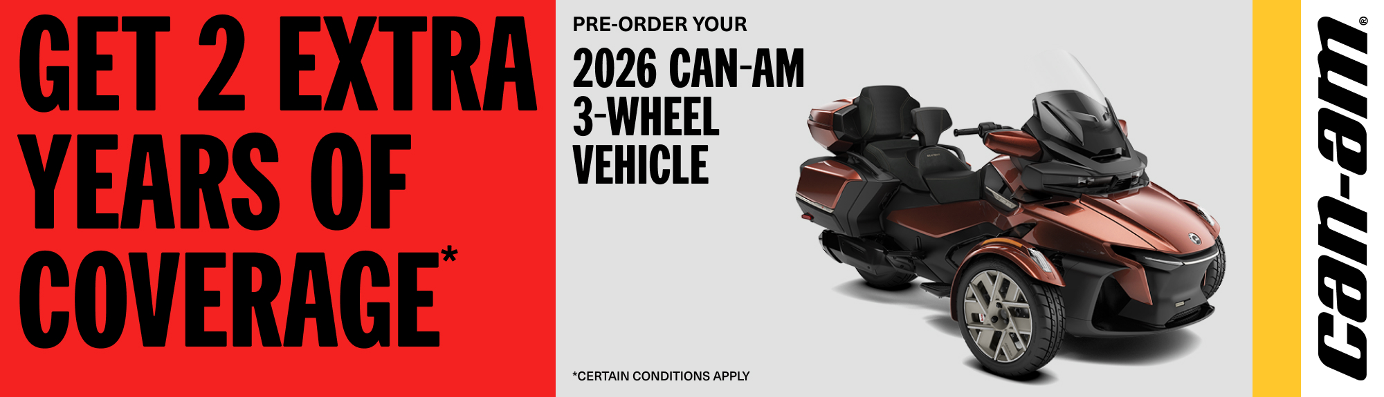 Pre-order a 2026 Can-Am 3-wheel vehicle and get two additional years of coverage