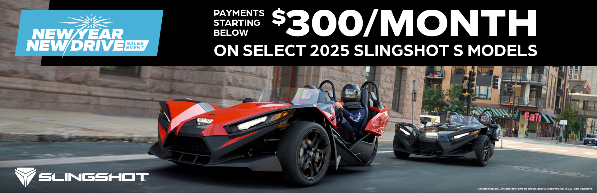 This is a limited time offer which is valid for the purchase of selected qualifying models and is subject to credit approval on qualified purchases financed during this program. Offer may not be combined with certain other offers, is subject to change and may be extended or terminated without further notice. Offer valid on new 2025 Slingshot® models (excluding Slingshot 10). Monthly payment and cost of borrowing will vary depending on amount borrowed and down payment/trade. Minimum amount to finance is $5,000. Example: $28,299 financed at 0.99% APR over 36 months = 36 monthly payments of $718; financed amount of $25,469 with $2,830 down payment, total cost of borrowing of $390 and a total obligation of $25,860. An example of monthly payments required on a 36-month term at 0.99% APR is $28.20 per $1,000 financed. Monthly payment examples assume 10% down and do not include taxes, title, and other fees. Offer only valid to qualified customers, not all customers will qualify, other offers available, see dealer for details. Offer Valid: January 1 – 31, 2026.